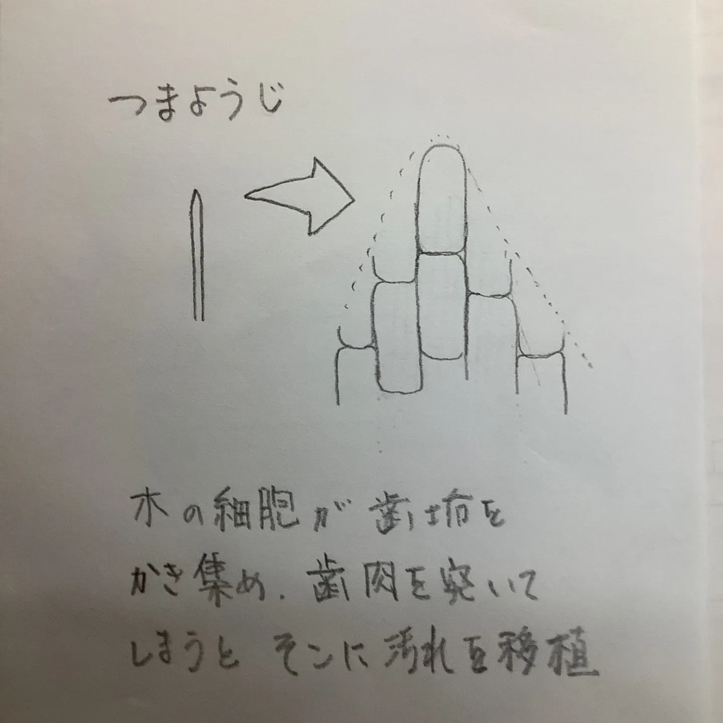 木製のつま楊枝は、その表面に目には見えない小さなギザギザが存在します。このギザギザが歯肉に接触すると、汚れをかえって押し込んでしまうことがあります。特にデリケートな歯肉の場合、これが原因で炎症を引き起こすこともありますので、使用は慎重にお願いしたいところです。