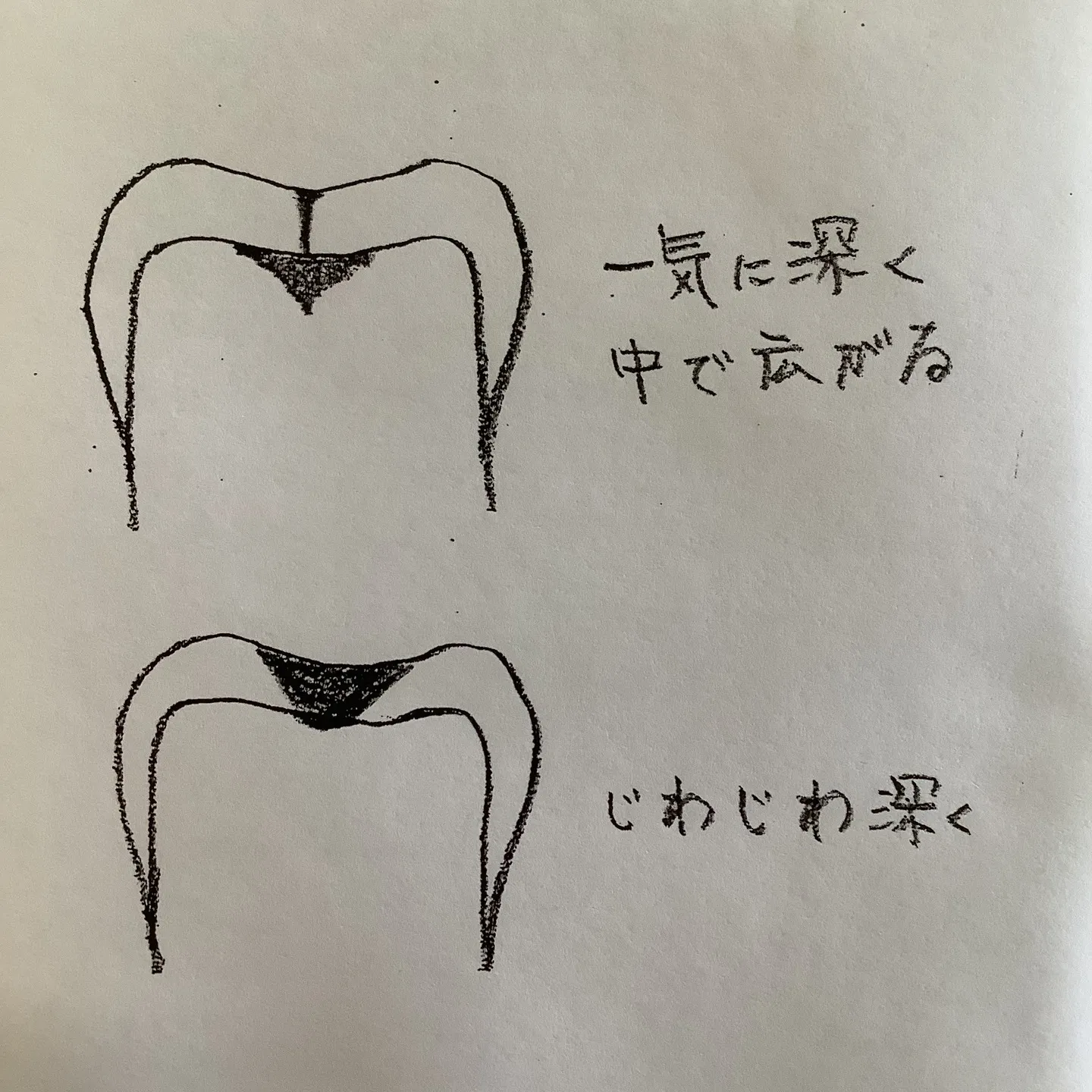 こんにちは。やまもと歯科医院です。虫歯は、実はその進行の仕方が異なることをご存じでしょうか?若い方に多いのは、一気に深く進んでから中で広がるタイプです。このタイプは、早期発見が難しいことがあります。一方で、年齢層が高めの方にはじわじわと進行していくタイプが多いです。どちらのタイプも、象牙質に達すると広がりやすくなるため、定期的なチェックと迅速な対応が非常に重要です。